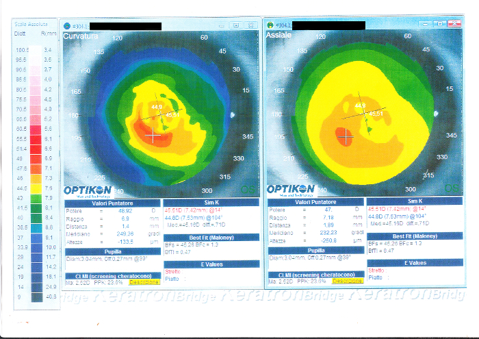 Gentile Signore, mi devo scusare ma non ricordo la telefonata intercorsa, comunque dall'analisi della topografia corneale si evidenzia la presenza di un cheratocono più avanzato nell'occhio destro e con la sola topografia non posso darle ulteriori informazioni.