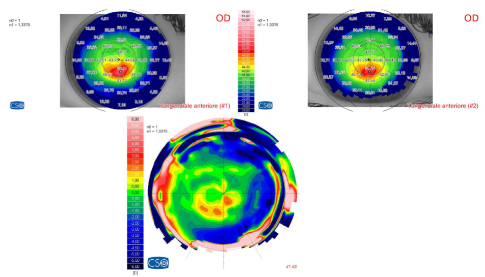 ho visionato le topografie dell'occhio destro del Sig. [...] e il quadro clinico è stabile, ovviamente è passato troppo poco tempo dal cross linking per valutarne l'efficacia effettuerei una topografia nell'occhio destro tra 6 mesi circa. Nel post operatorio per cross linking è normale nei primi tempi la possibilità di vedere lievemente opacato ma poi tali sintomi tendono a regredire.