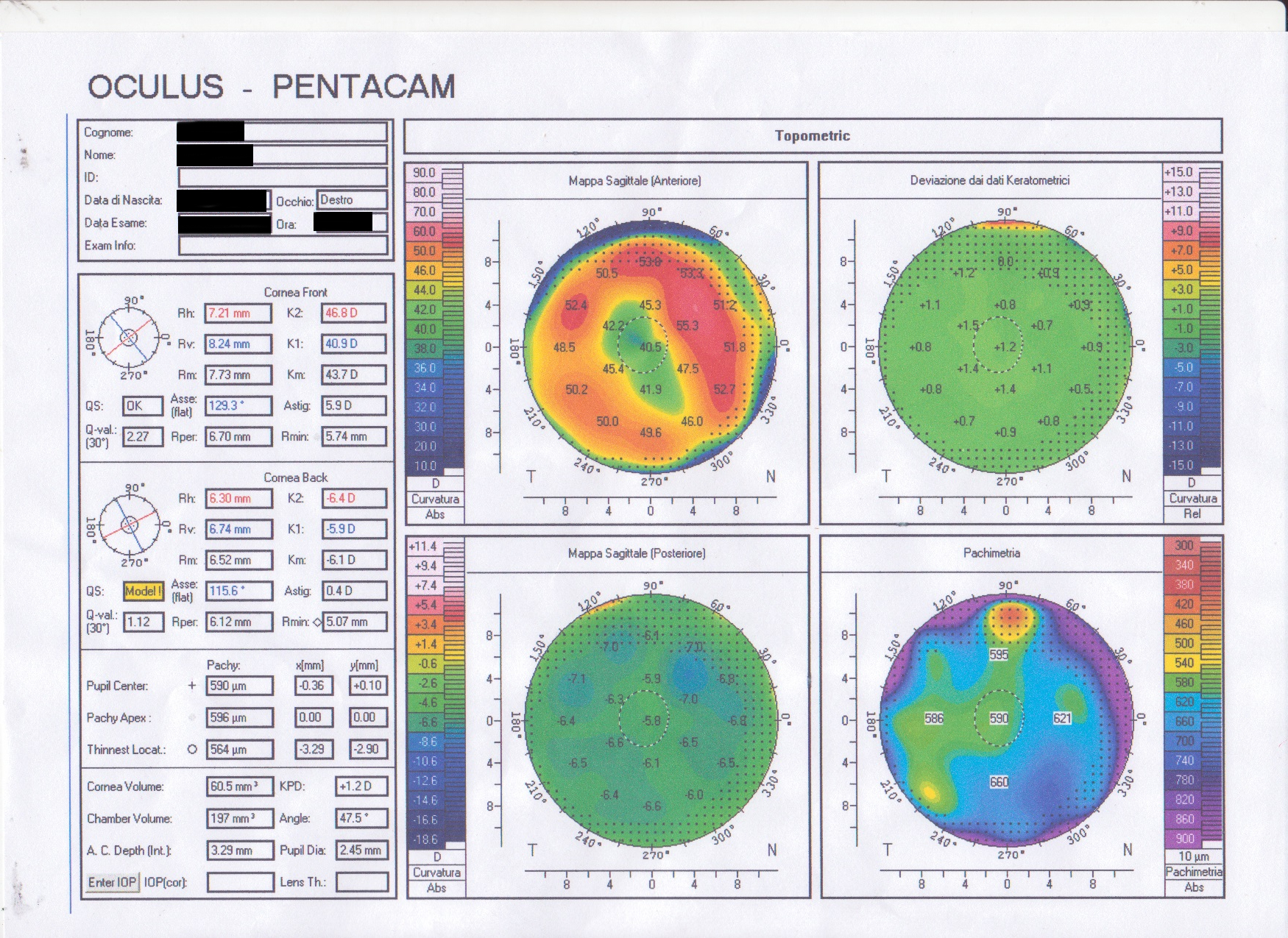 topografia corneale occhio dx per valutare se è possibile effettuare un intervento per l'astigmatismo post trapianto fatto nel 1998 che al momento e di 6 diottrie miopico con asse 120. Saluti.