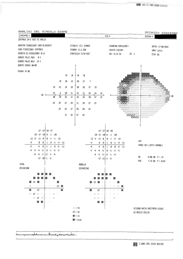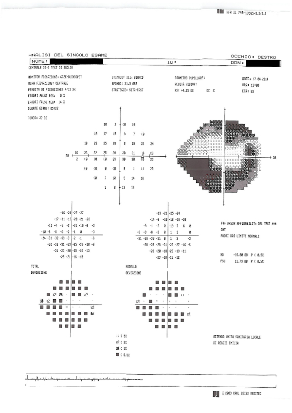Attualmente in terapia topica con colliri antiglaucomatosi in compenso tonometrico. I campi visivi nel tempo sono rimasti stabili anche se con alterazioni glaucomatose, la tonometria (effettuate anche le curve tonometriche) è compensata e il nervo ottico invariato nel tempo.