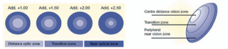 Il suo successo è dovuto al progressivo appiattimento del raggio di curvatura dal centro verso la periferia; il graduale aumento di potere , offre così la correzione dell’ametropia nella zona centrale e la correzione della presbiopia nella porzione periferica.
