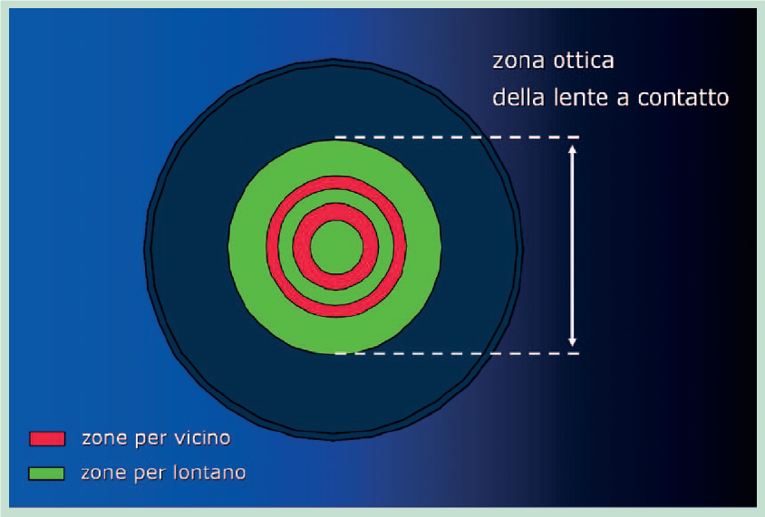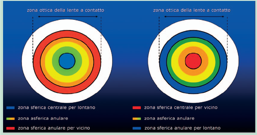 Come già accennato, le lenti a contatto con geometria concentrica prevedono una zona ottica centrale e uno o più anelli collocati attorno a questa; nel caso ci siano più anelli, questi vengono alternati tra la visione per il vicino e per il lontano. Quindi una zona (L) ha la funzione di emmetropizzare l’occhio, l’altra (V) di miopizzarlo, al fine di avere una correzione per la presbiopia.