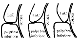 Fig.2: Rapporto tra bordo della lente e palpebra inferiore. Nella prima figura abbiamo un buon appoggio che garantisce comfort e stabilità; nella seconda e nella terza figura abbiamo disegni della lente che favoriscono un posizionamento non ottimale oltre che aumentare la probabilità di microtraumi.