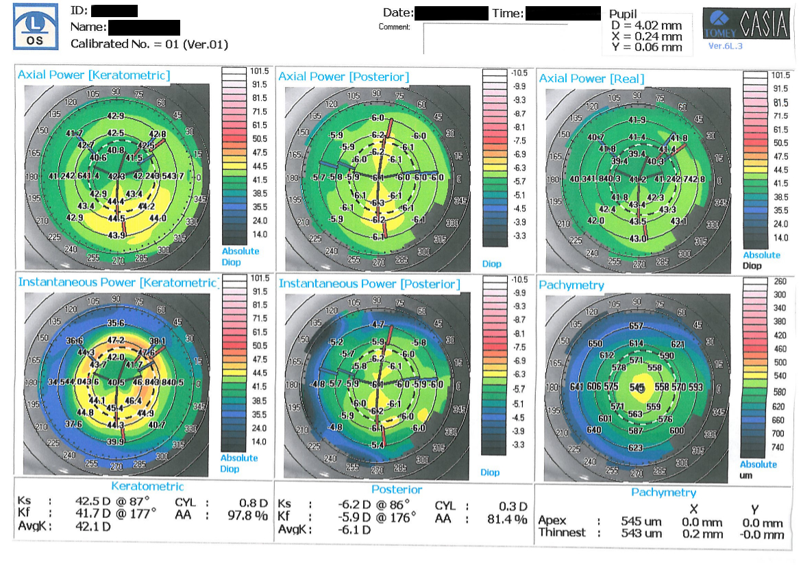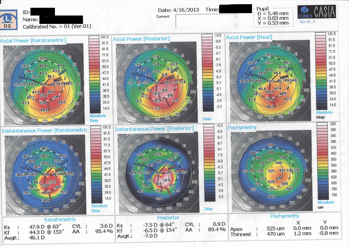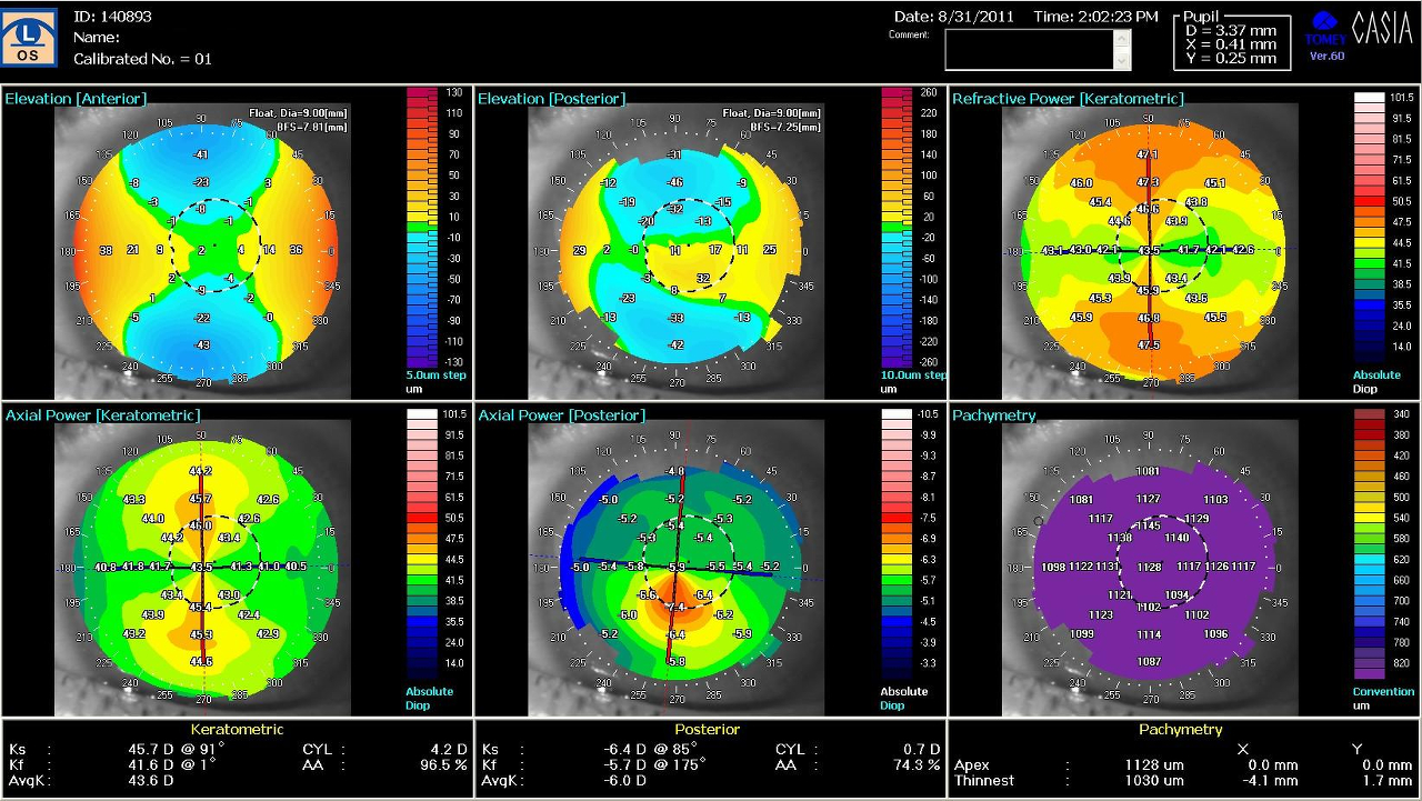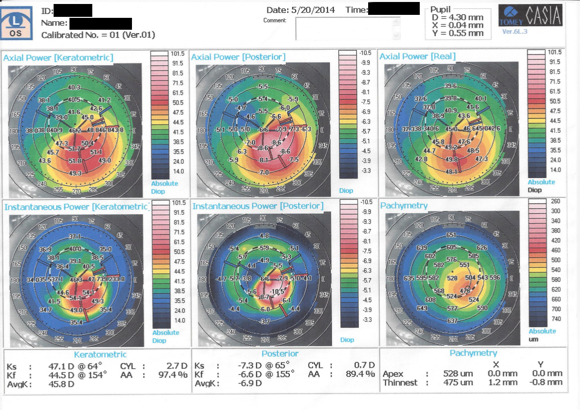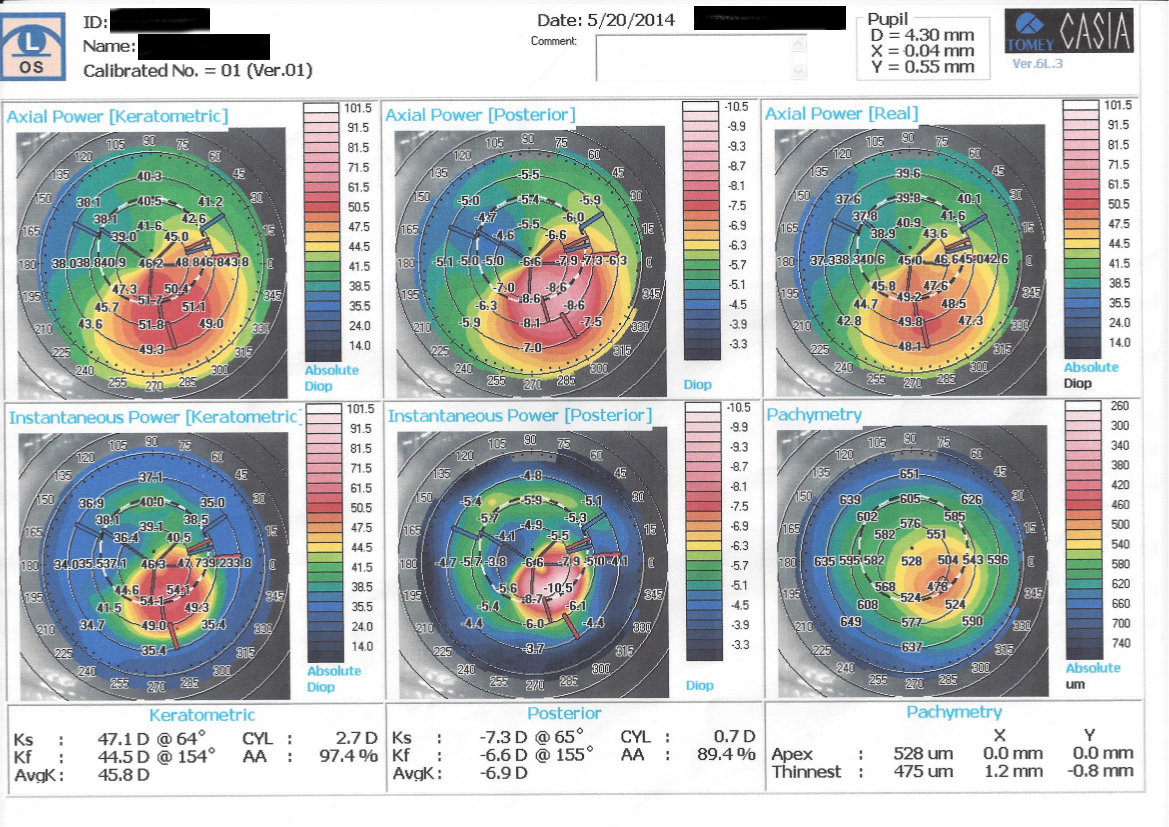 Paziente di 32 anni riferisce da alcuni mesi calo visivo con sdoppiamento delle immagini nell'occhio sinistro, aveva già effettuato OCT macula e nervo ottico. Campo visivo risultati nella norma e topografia corneale (vedi allegato).