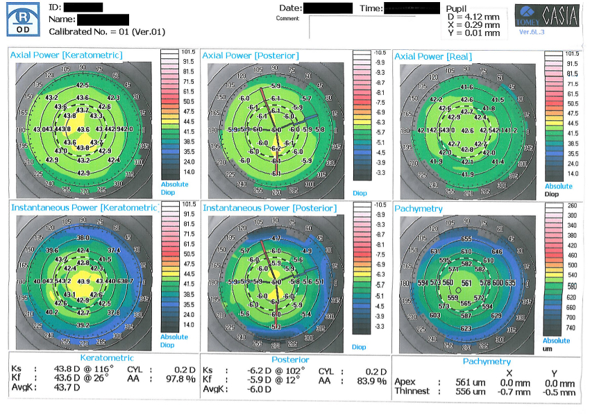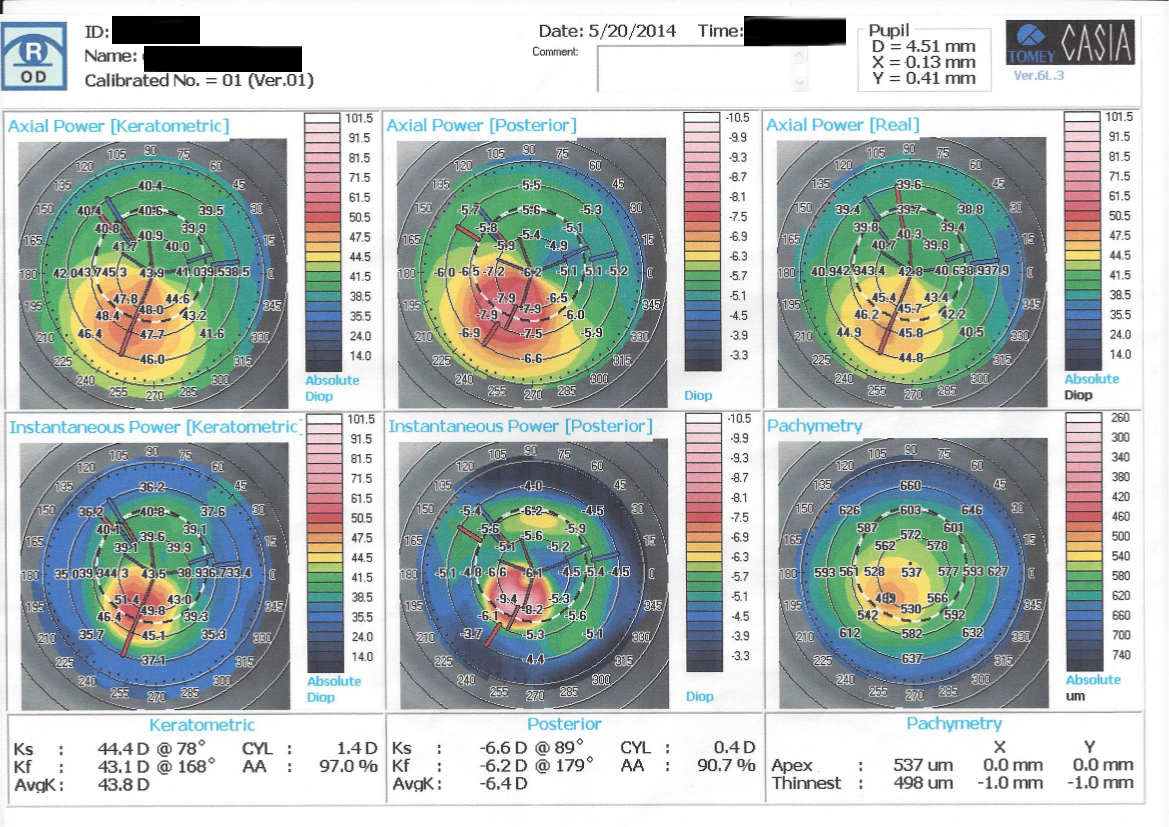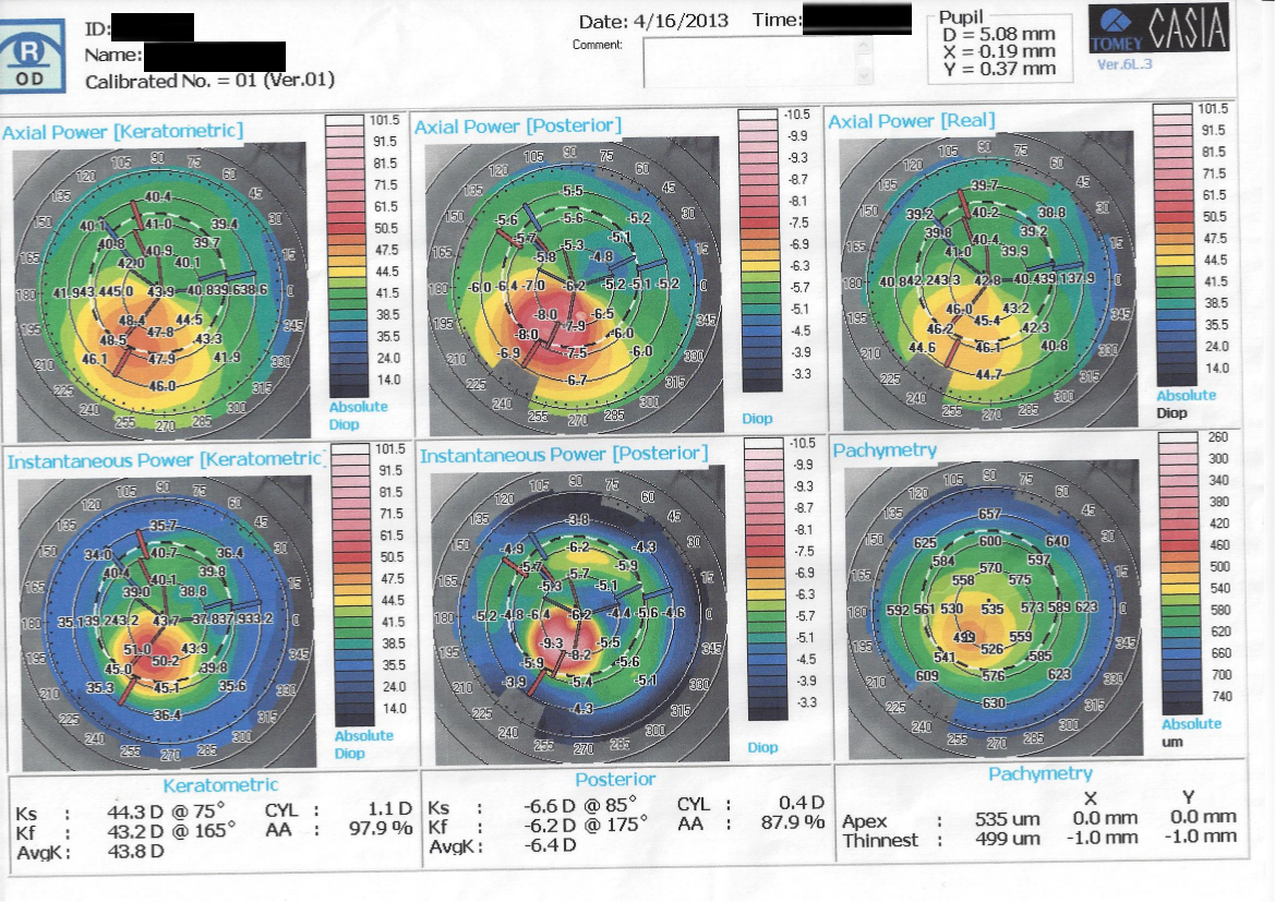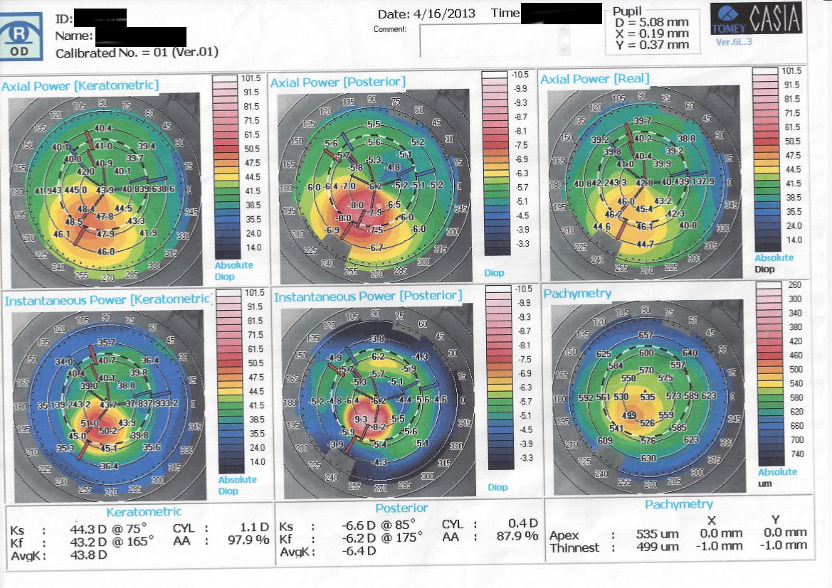 Il quadro clinico-strumentale indica la presenza di un iniziale cheratocono (o di un cheratocono frusto).