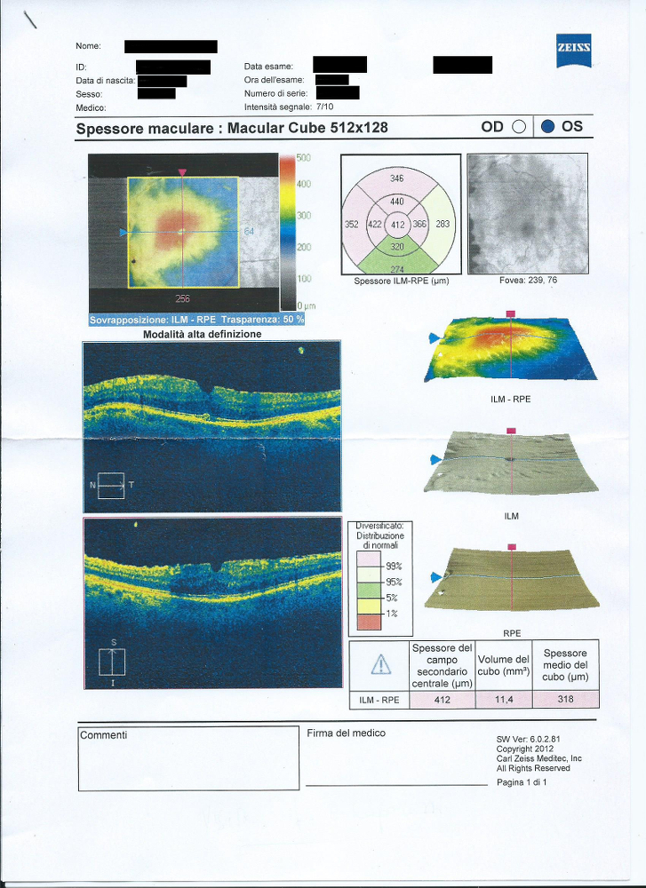 La prima riguarda il mio problema all'occhio sinistro di cui sono affetto dal [...] 2013 dopo aver fatto una O.C.T. il responso recitava come segue: membrana epiretinica parzialmente adesa, si apprezza la depressione foveoale (FT 336 micron) iporiflettività diffusa riferibile ad edema maculare. Presente un piccolo distacco bolloso in sede subfoveale. Ho fatto una visita specialistica a [...] e [...] presso noti e affermati professori, ripetuto per altre due volte l'esame O.C.T. e avendo un buon visus 8-9/10 mi è stato detto da entrambi i medici interpellati di continuare con i controlli periodici finchè il visus arriverà a 5/10 e poi fare la vitrectomia, con tutte le eventuali complicanze che tale intervento può comportare. Le allego le OCT fatte e l'esame del visus per un suo parere.
