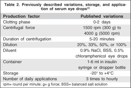 Blood is extracted from patient's vein with vacuum extraction tubes without anticoagulant. Subsequently, the tubes are left in vertical position at 22°C for about 2 hours to allow coagulation. After blood clot is formed, supernatant is centrifuged to separate the serum from the solid components. A bottle of serum eye drops with the desired concentration, adequately identified and preserved from light is given to the patient. It is important to keep the eye drops away from light because some of its components (vitamin A) degrade quickly with light exposure. Most prepared all the autologous serum eye drops with fresh serum, giving the flasks to the patients for their utilization, recommending them to keep the one in use in the refrigerator at +4°C(5).