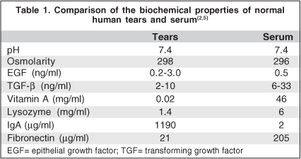 Human serum contains substances such as epidermal growth factor, vitamin A, transforming growth factor-β , fibronectin, and cytokines normally found in tears. These factors are important for maintaining a healthy corneal and conjunctival epithelium. The rationale for the topical use of autologous serum is based on the premise that chemotactic and growth factors present in tears are also present in patient's own serum. Moreover, the biochemical properties of the serum are similar to that of normal tears.